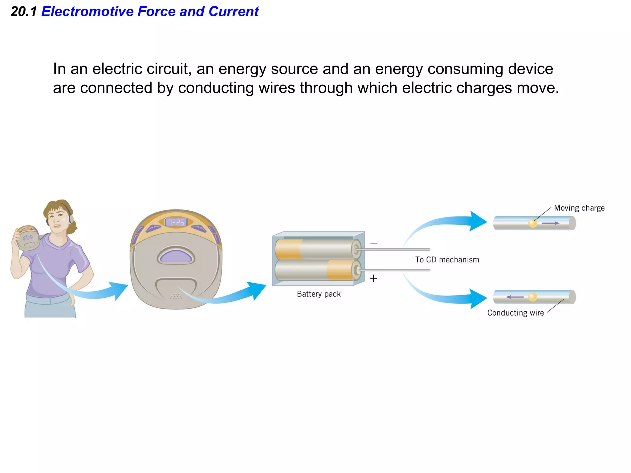 1. An electric circuit connects an energy source to an energy consuming device through conducting wires that allow electric charges to move. Electromotive force drives current, measured in amperes, through a circuit.