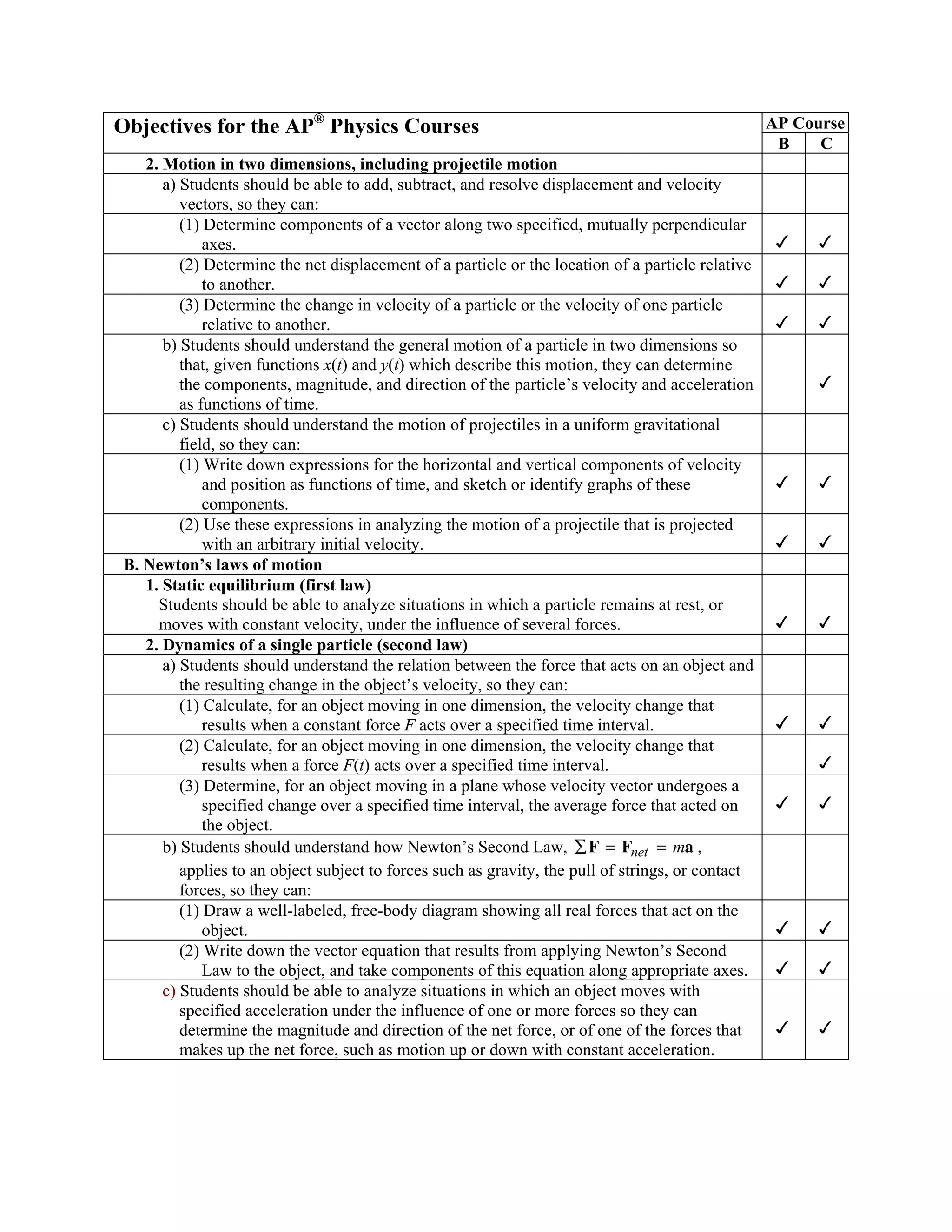 This document lists learning objectives for AP Physics courses. It covers objectives in five major content areas: Newtonian mechanics, work, energy and power, systems of particles and linear momentum, circular motion and rotation, and electric and magnetic fields. The objectives describe essential concepts and skills students should understand, such as kinematics, Newton's laws of motion, work-energy theorem, conservation of energy, impulse and momentum, uniform circular motion, and more. The objectives are used to guide the content of the AP Physics exams.
