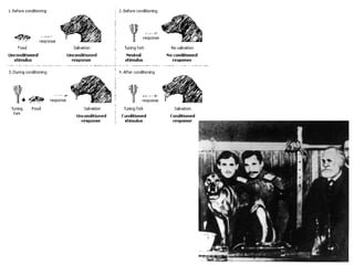 The document provides an overview of classical and operant conditioning concepts. It defines classical conditioning and discusses Ivan Pavlov's experiments. It then explains various classical conditioning processes like acquisition, extinction, generalization, and discrimination. It also defines operant conditioning and discusses B.F. Skinner's experiments. It explains operant conditioning concepts like reinforcement, schedules of reinforcement, and punishment. It concludes by discussing observational learning research by Albert Bandura and applications of behaviorism.