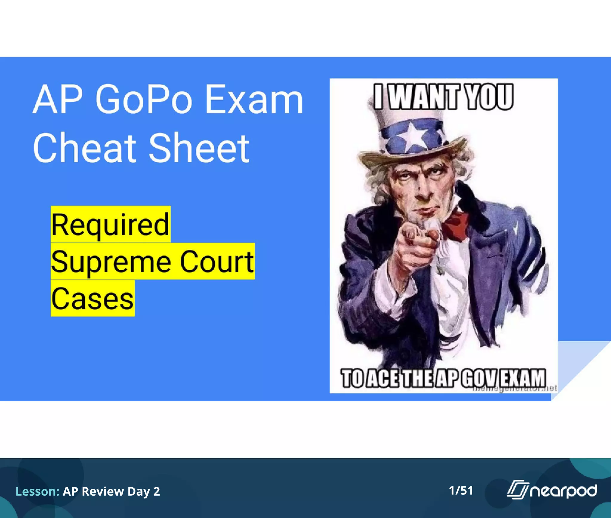 The document appears to be a series of slides from an AP review lesson on day 2. It covers various topics related to US constitutional law and Supreme Court cases, including discussions of enumerated vs implied powers, the impact of key cases like McCulloch v. Maryland and Marbury v. Madison, and comparisons of different court cases. It also includes brief quizzes on required court cases and foundational documents like the Articles of Confederation.