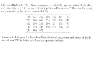 The document discusses how to display distributions using various graphical methods such as dot plots, stem plots, histograms, and box plots, emphasizing the importance of interpreting the overall shape, center, spread, and outliers in quantitative data. It provides guidelines for creating these graphs, examining distributions, and comparing two or more groups using visual techniques. Additionally, it highlights common mistakes and offers cautions for using these graphical methods effectively.