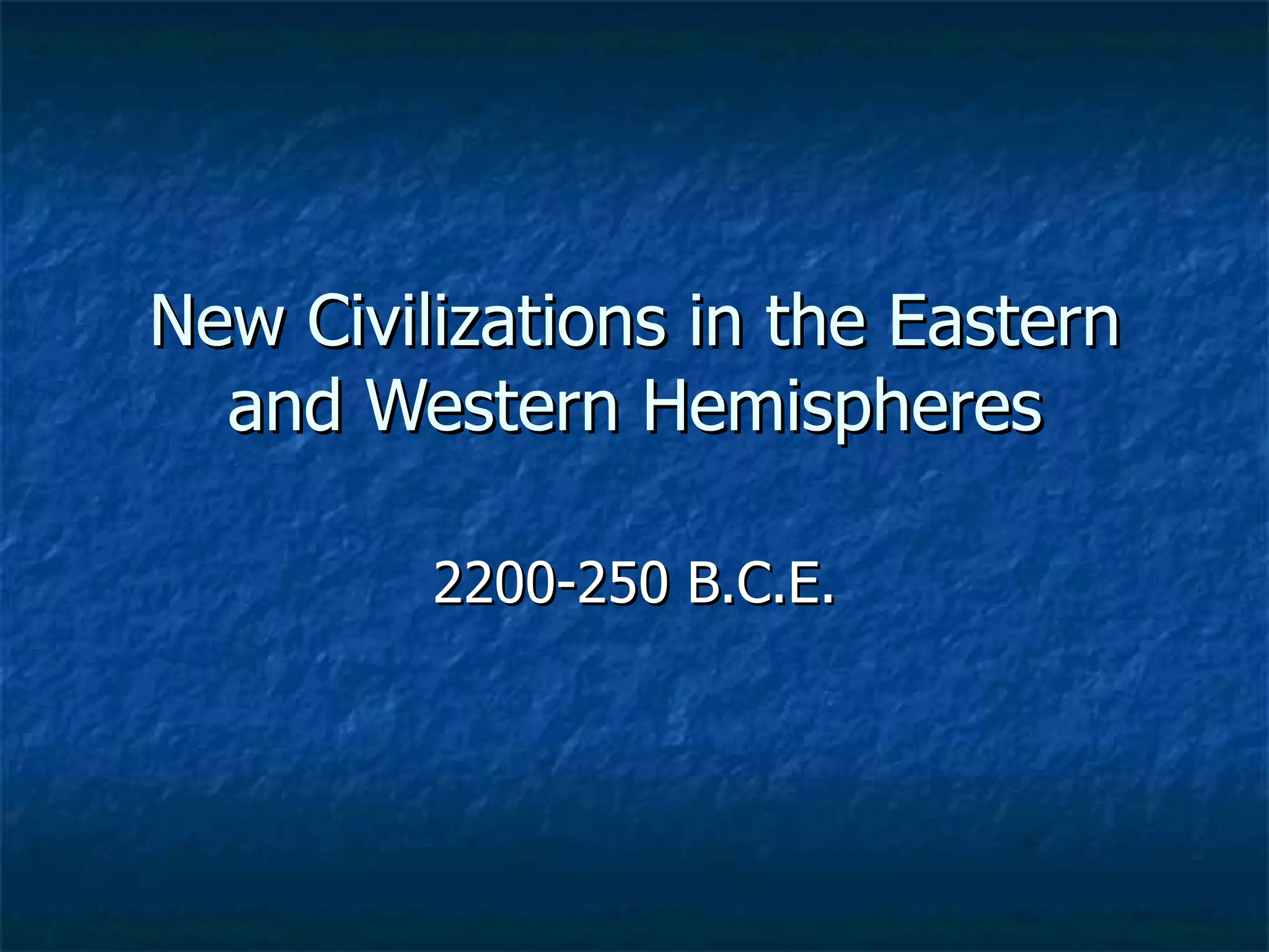 The document summarizes the development of early civilizations in China, Nubia, and the Americas between 2200-250 BCE. In China, the Shang Dynasty ruled from 1750-1027 BCE in the Yellow River Valley and established oracle bone writing. The Zhou Dynasty then overthrew the Shang and split into the Western and Eastern Zhou periods. Philosophies like Confucianism, Daoism, and Legalism emerged. In Nubia, the Kingdom of Kush developed south of Egypt and the Kingdom of Meroë later ruled as far north as Egypt. The Olmec civilization in Mesoamerica built cities along the Gulf coast and established complex architecture, calendars, and sculpture. In