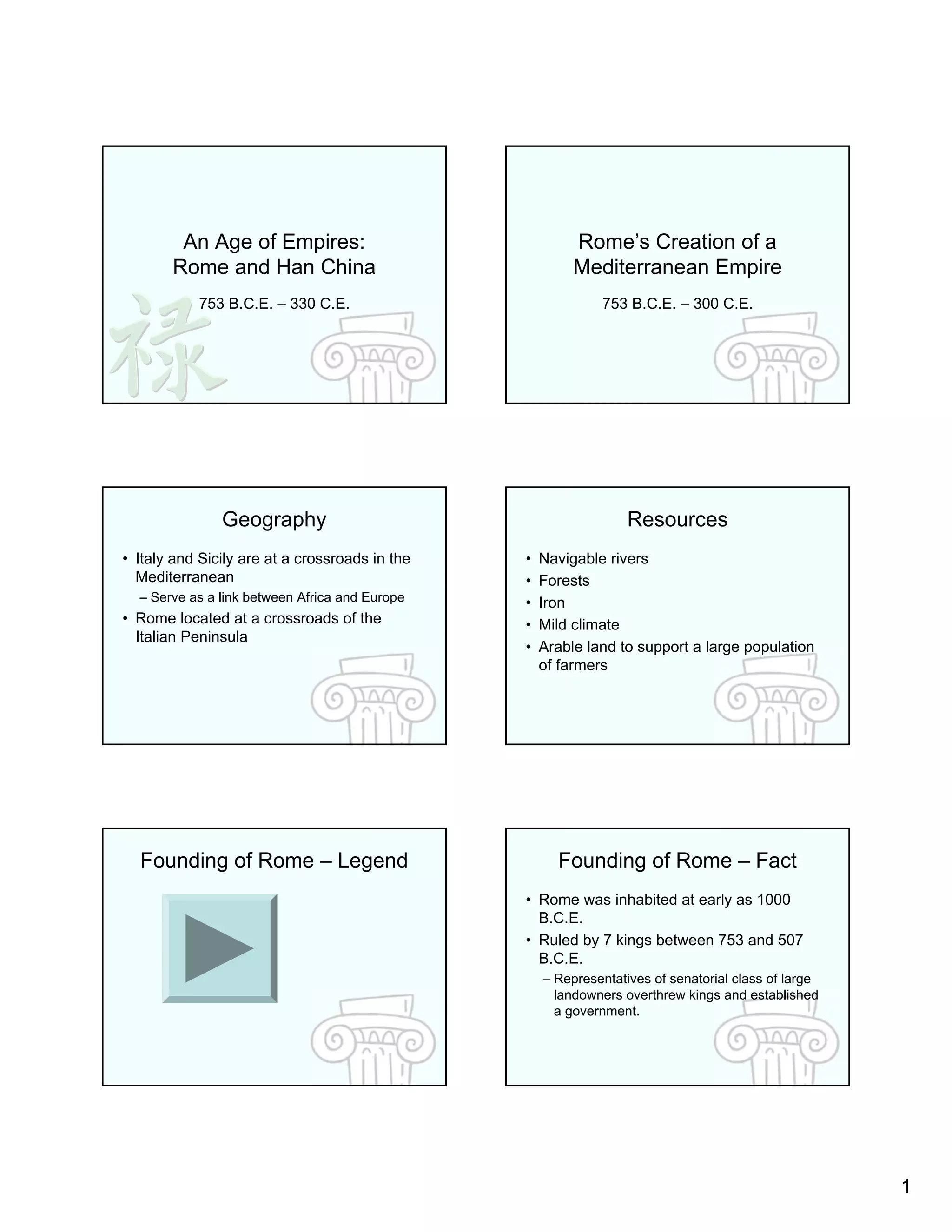 The document provides information about Rome and Han China between 753 BCE and 330 CE. It describes the founding and expansion of Rome as it conquered the Mediterranean region. It also details the establishment of the Qin and long reign of the Han dynasties in China as they expanded their empire and standardized government. Both empires developed advanced urban societies and economies but eventually declined due to overexpansion of territory, the high costs of defense, and nomadic invasions.