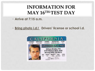 This document provides information and tips for students taking the May 16th AP World History exam. It outlines what to bring on exam day, when to arrive, and instructions during the exam. The exam will be 3 hours and 5 minutes long and consist of a 55 minute multiple choice section followed by essay writing. The document emphasizes time management and targeting points by fully answering the prompts in the essays.