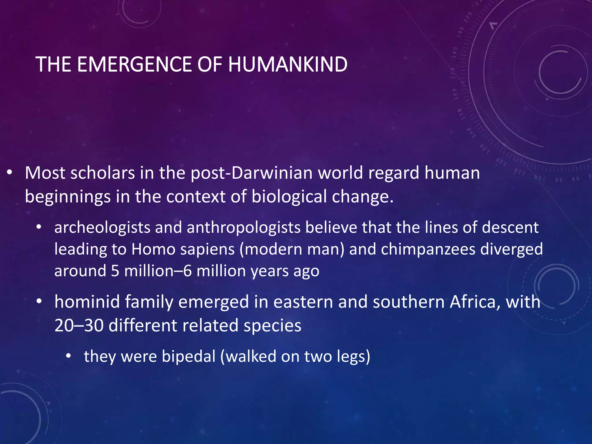 This document provides an overview of early world history from the emergence of humankind to the development of civilizations. It discusses how hominids evolved in Africa around 5-6 million years ago and began migrating from Africa around 2 million years ago. Around 11,000 years ago, the agricultural revolution began as some hominid groups started domesticating plants and animals, allowing for population growth and division of labor. Some of the first complex civilizations emerged around 3500 BCE in river valleys and dominated the globe until the post-1000 CE era. Civilizations laid the foundations for modern empires, religions, technologies, and social inequalities.