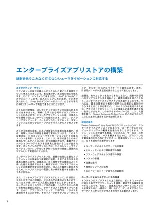 2 エンタープライズアプリストアの構築 統制を失うことなく IT のコンシューマライゼーションに対応する エグゼクティブ・サマリー テクノロジーが毎日の暮らしにもたらした驚くべき利便性に ついて考えてみましょう。ある書評が、あなたの関心を捕え ます。そこで、オンラインで本を注文し、iPad® や