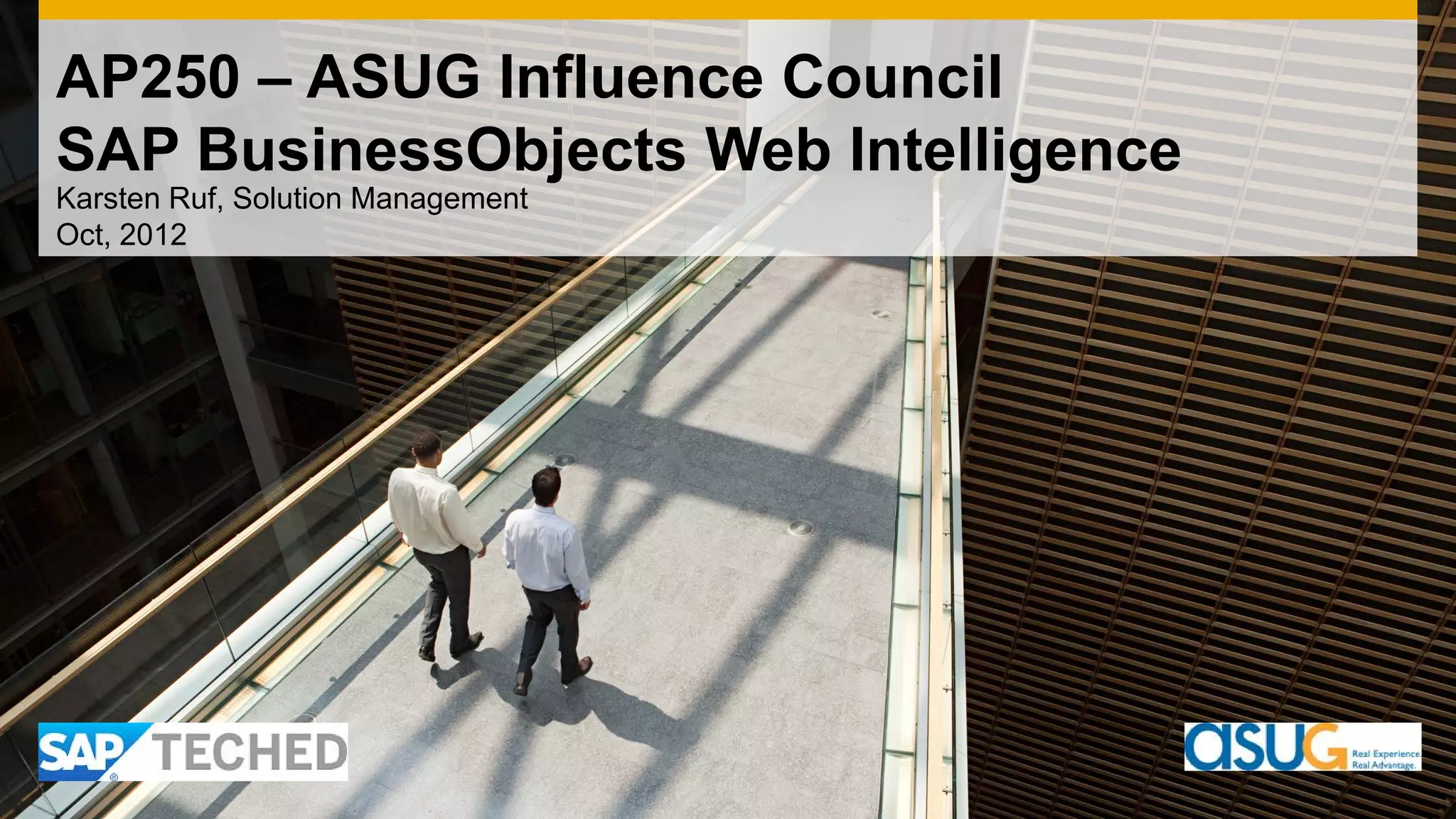This document discusses an agenda for an SAP BusinessObjects Web Intelligence Influence Council meeting. It introduces the council leadership and provides an overview of the council's objectives. It also presents Web Intelligence's product roadmap, including improvements to the user experience, visualizations, data access, and support for developers and mobile. The roadmap discusses capabilities for both the current release and planned innovations. The meeting aims to gather feedback on priorities and implementation for developing future Web Intelligence releases.