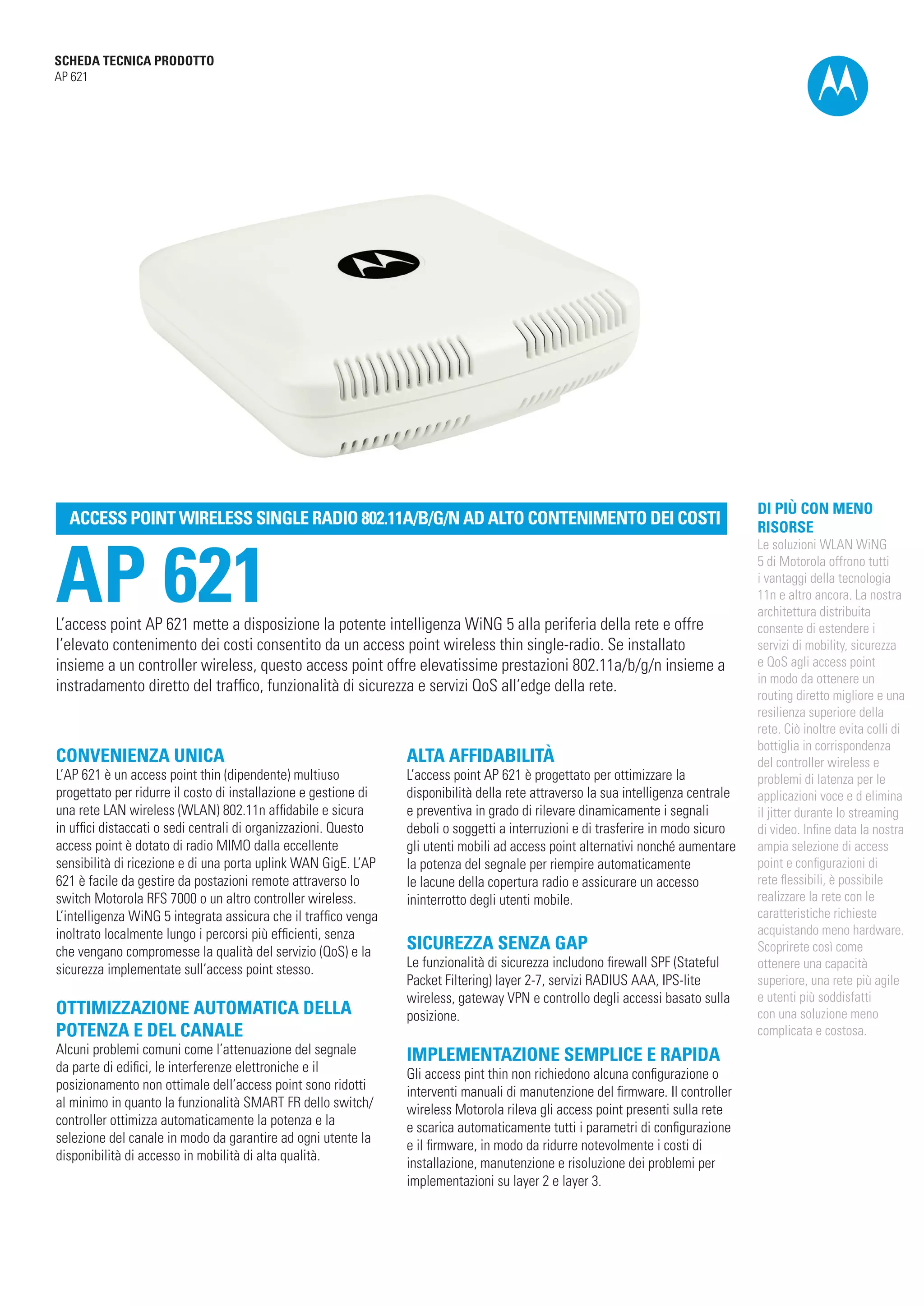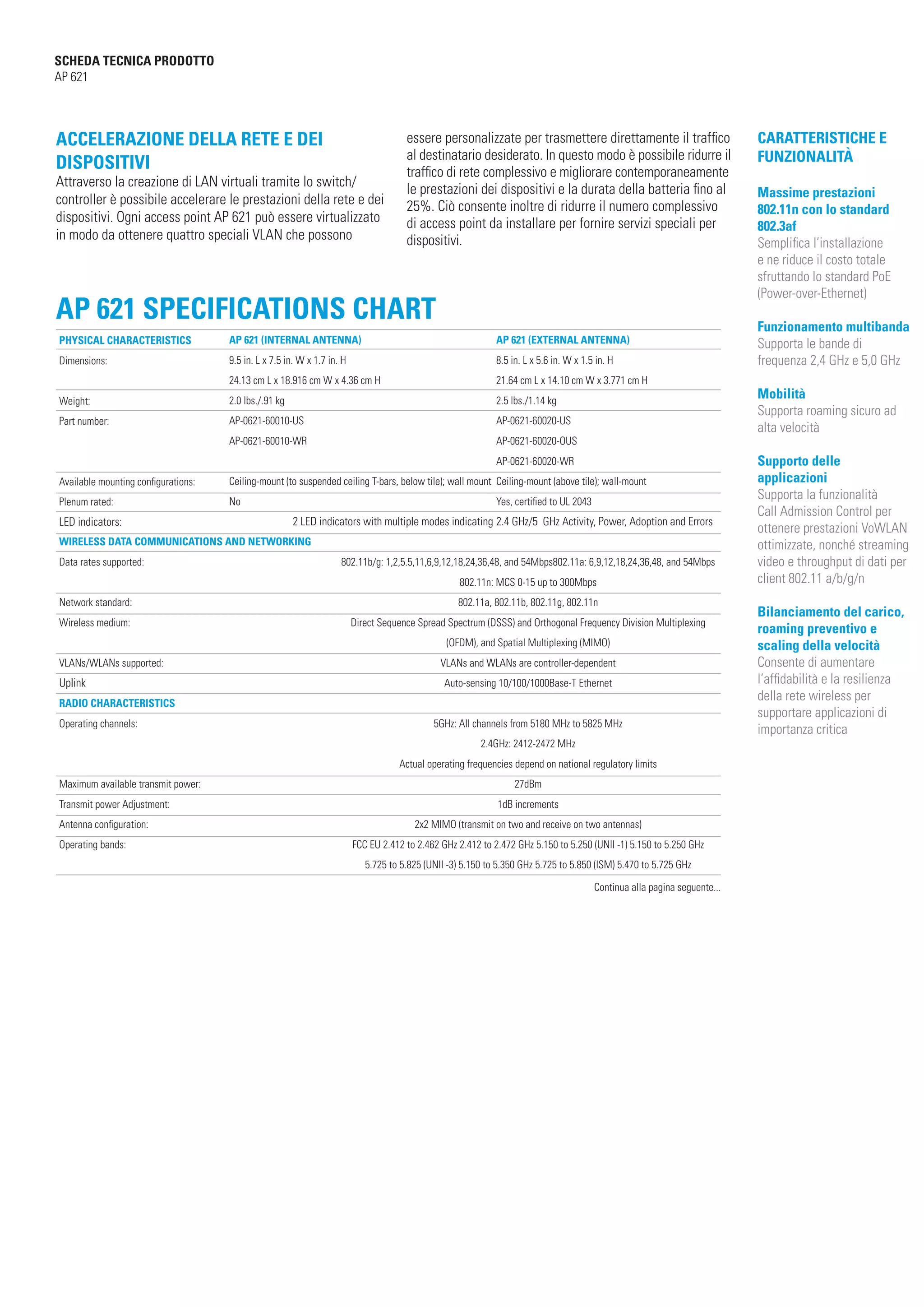 L'access point AP 621 è un dispositivo wireless single-radio 802.11a/b/g/n progettato per offrire prestazioni elevate a basso costo, ottimizzando la gestione della rete WLAN in ambienti aziendali. Dotato di intelligenza WI-FI 5, offre sicurezza avanzata e gestione semplificata tramite controller wireless, garantendo un accesso ininterrotto e una qualità del servizio. La tecnologia MIMO e la capacità di virtualizzazione delle LAN consentono di migliorare le prestazioni e l'efficienza energetica, riducendo la necessità di hardware aggiuntivo.