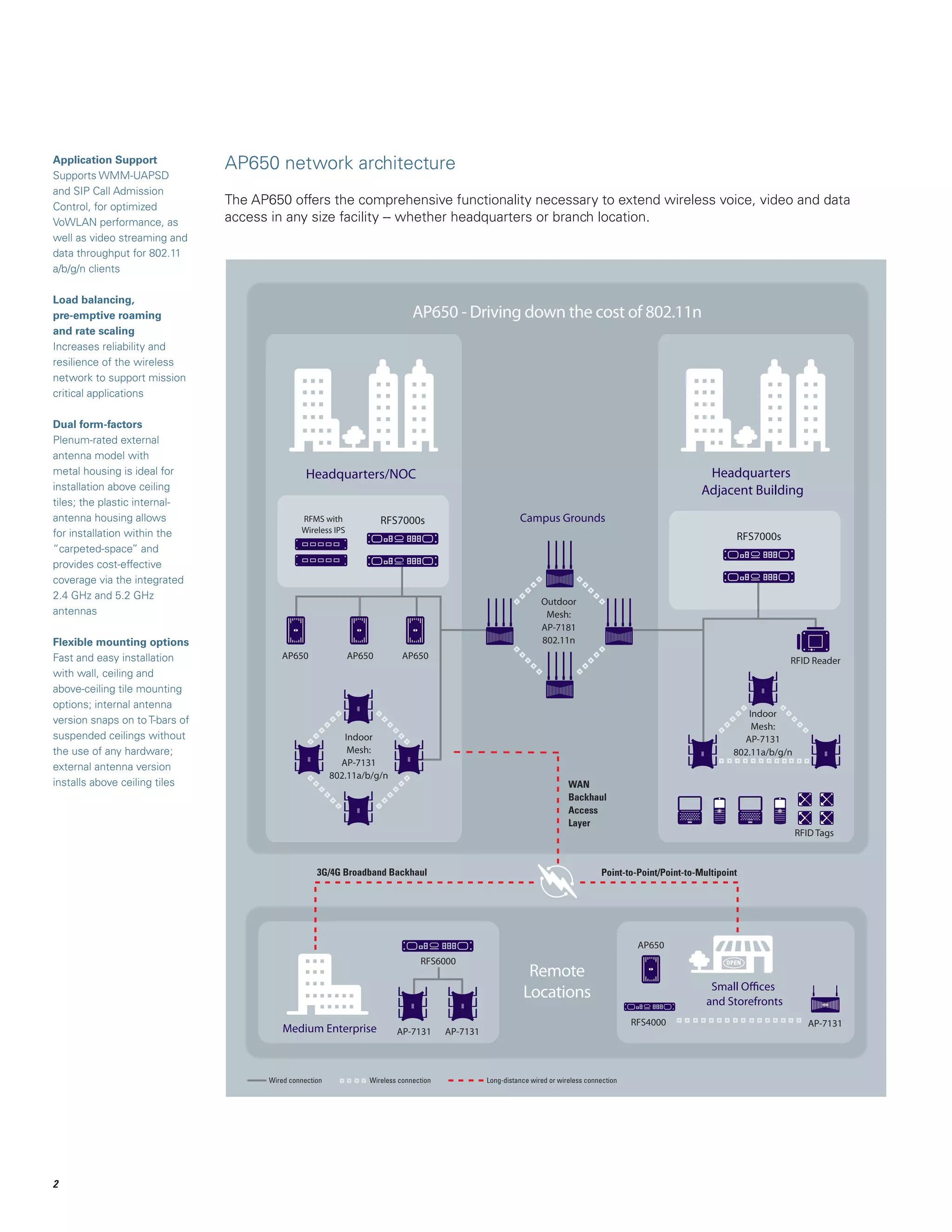 The AP650 is a thin 802.11n wireless access point that offers simultaneous wireless LAN access and sensing. It provides full 802.11n performance using standard Power-over-Ethernet, supports fast secure roaming, and allows remote helpdesk support through wireless spectrum analysis and troubleshooting. The AP650 offers security features including firewall, authentication, and wireless intrusion prevention, and allows for easy installation and maintenance by deriving intelligence from a wireless switch/controller.