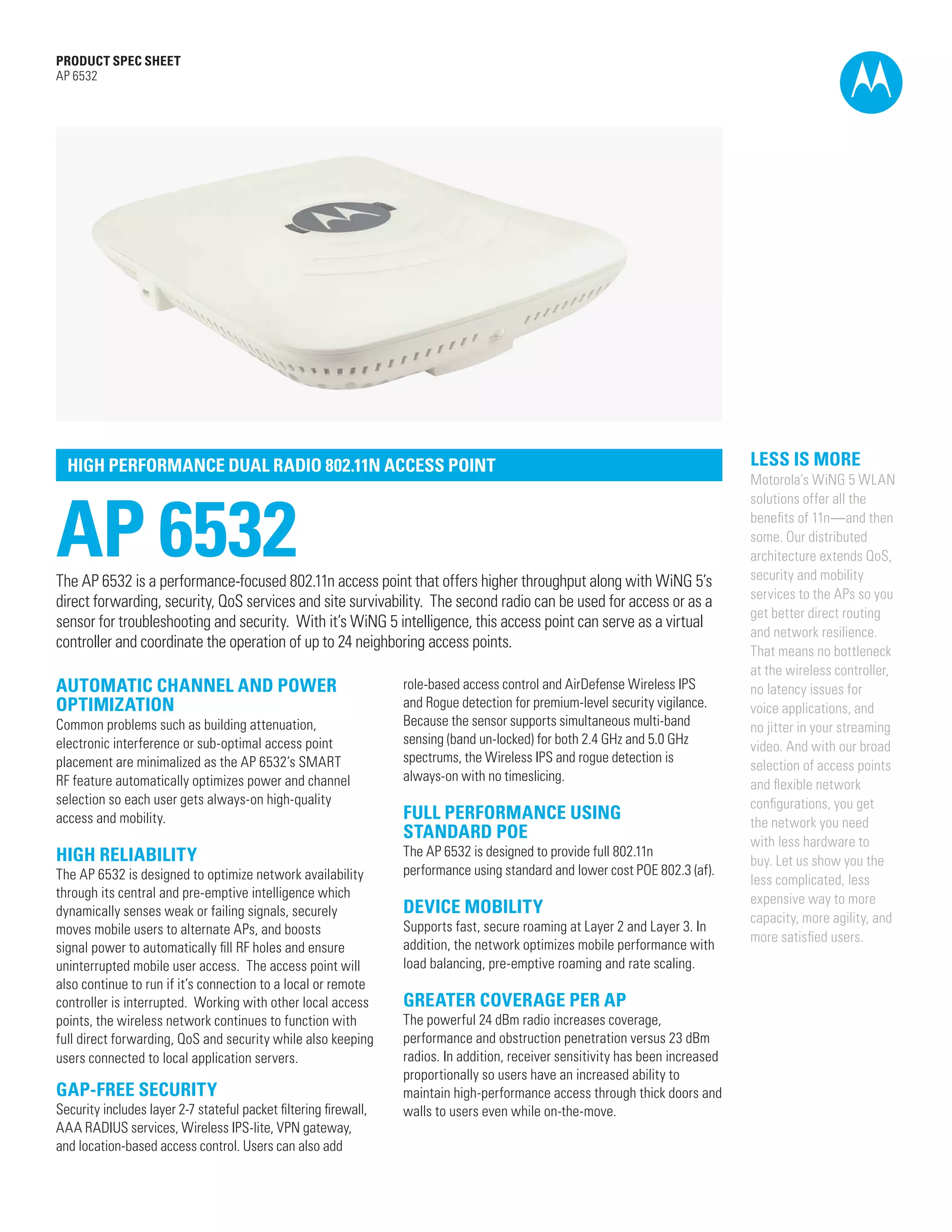 The AP 6532 is a dual-radio 802.11n access point that offers high throughput and WiNG 5 intelligence. It can serve as a virtual controller for up to 24 access points. It features automatic channel and power optimization, high reliability through signal sensing and pre-emptive roaming, and gap-free security including firewalls and wireless IPS. It is designed to provide full performance using standard PoE and supports fast, secure roaming and device mobility.