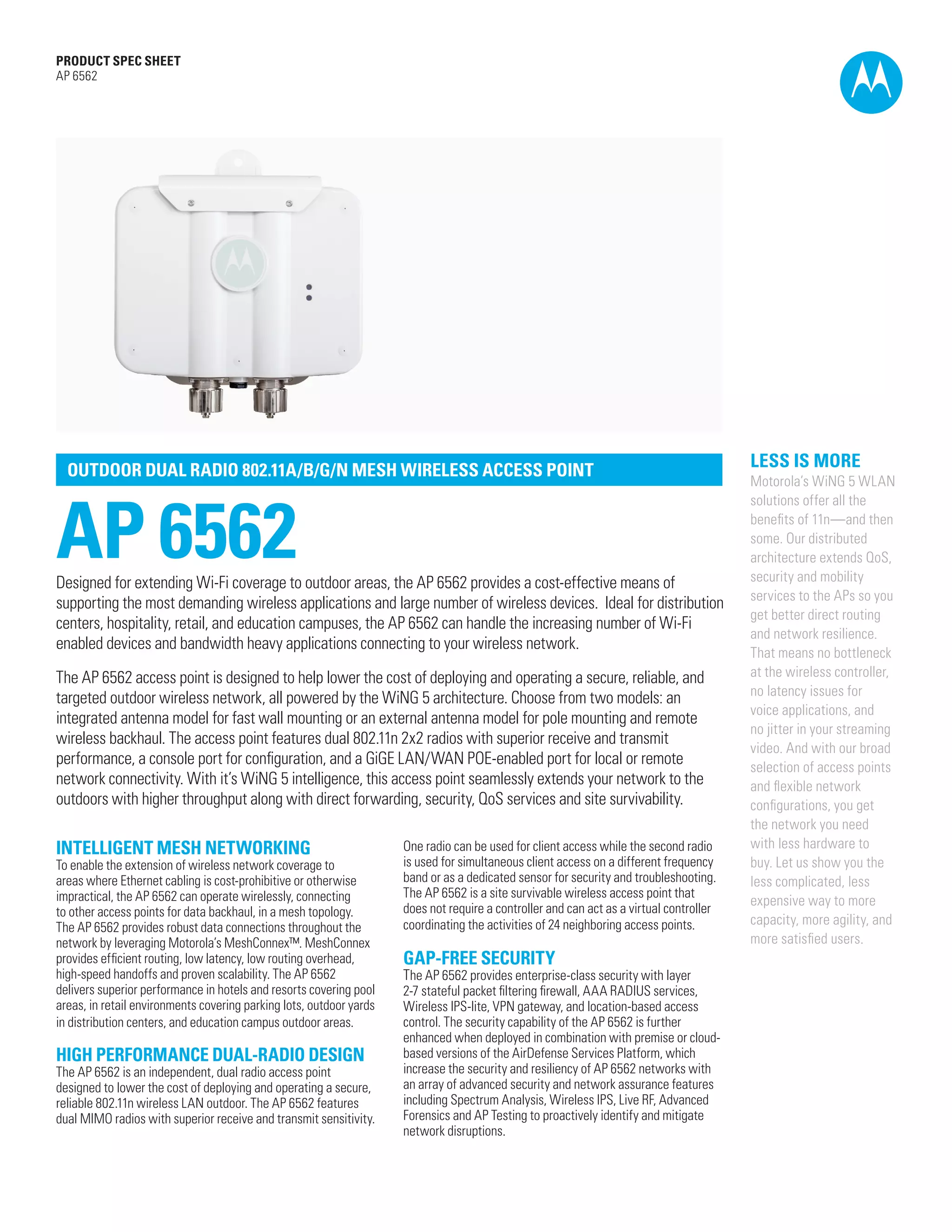 The AP 6562 is an outdoor dual radio 802.11a/b/g/n wireless access point designed to extend Wi-Fi coverage to outdoor areas in a cost-effective way. It can handle increasing numbers of wireless devices and bandwidth-heavy applications. It features dual radios, superior receive and transmit performance, PoE support, and mesh networking capabilities to wirelessly connect to other access points. The access point provides security, quality of service, and survivability through its WiNG 5 architecture.