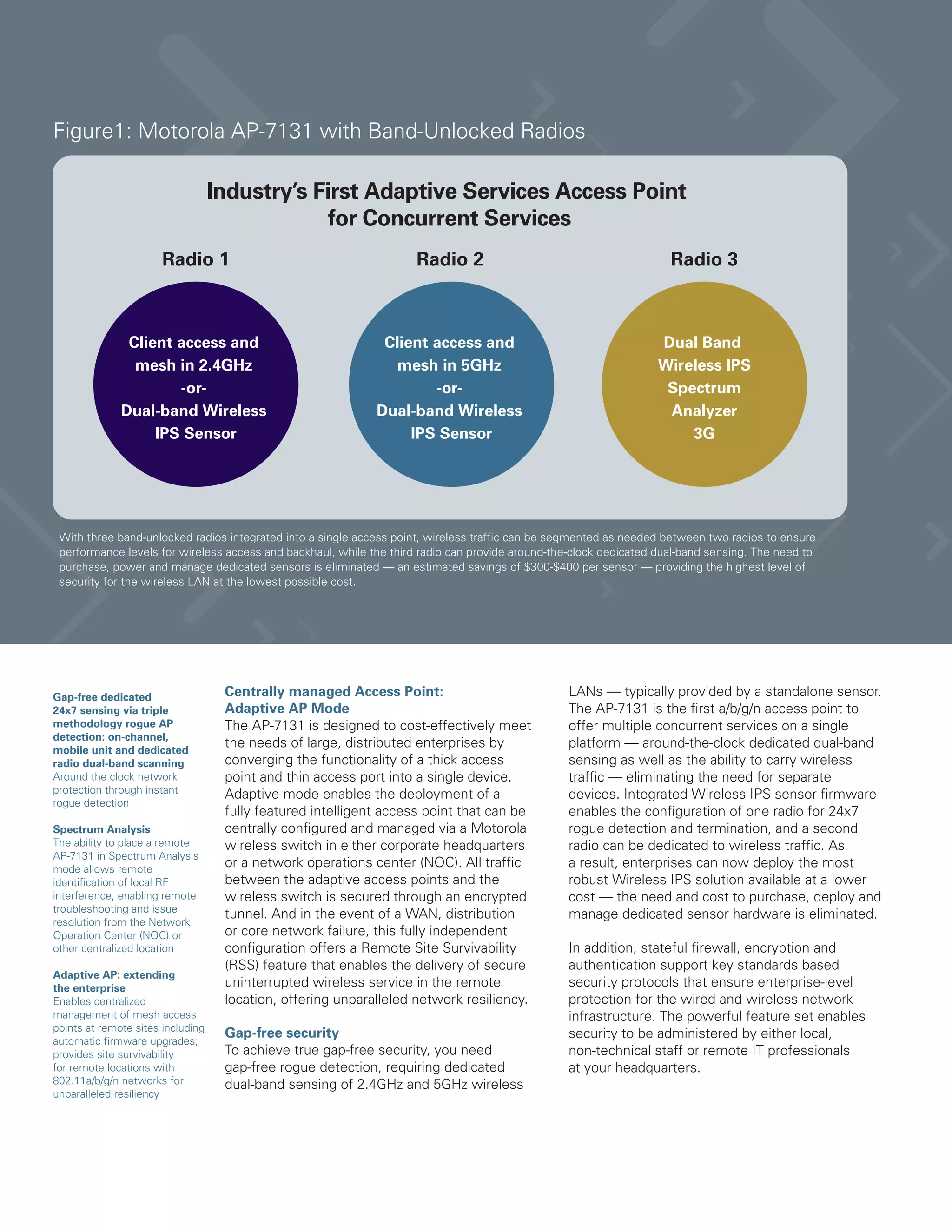 The AP-7131 is an 802.11n access point with 3 radios that provides high-speed wireless data, voice, video, mesh networking, and wireless intrusion prevention system (IPS) functionality. It delivers maximum wireless network throughput of up to 600 Mbps. The tri-radio design allows the device to dedicate radios to different functions like client access, mesh networking, and 24/7 wireless IPS sensing. It can operate as either a standalone access point or centrally managed by a wireless switch. The multi-functionality reduces costs by eliminating the need for separate devices and infrastructure to support different network services.