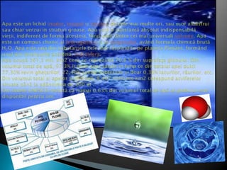 Potrivit UNESCO, cea mai pură apă se găsește în Finlanda, iar studiile au examinat apa în 122 de țări. Cercetările arată că apa fierbinte îngheață mai repede decât cea rece, deși motivul nu este complet înțeles. Apa joacă un rol esențial în mediul natural și sănătatea umană, dar 85% din bolile globale sunt transmise prin apă.