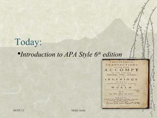The document provides an introduction to the APA style guide for citing and referencing sources. It outlines the general APA format for citing sources in-text and providing a list of references. Examples are given for different source types, including journal articles, books, book chapters, reports and online sources. General guidelines are also covered, such as formatting author names and listing references alphabetically.