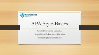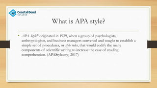 This document provides an overview of APA style formatting. It explains that APA style was created to codify scientific writing and increase readability. The style consists of uniform guidelines for elements such as headings, punctuation, citations, and references. The document outlines the key parts of an APA style paper including the title page, abstract, body, and references page. It provides examples of how to cite different sources like books, magazines, newspapers, and websites in both the text and references. Additional resources for APA style are referenced.