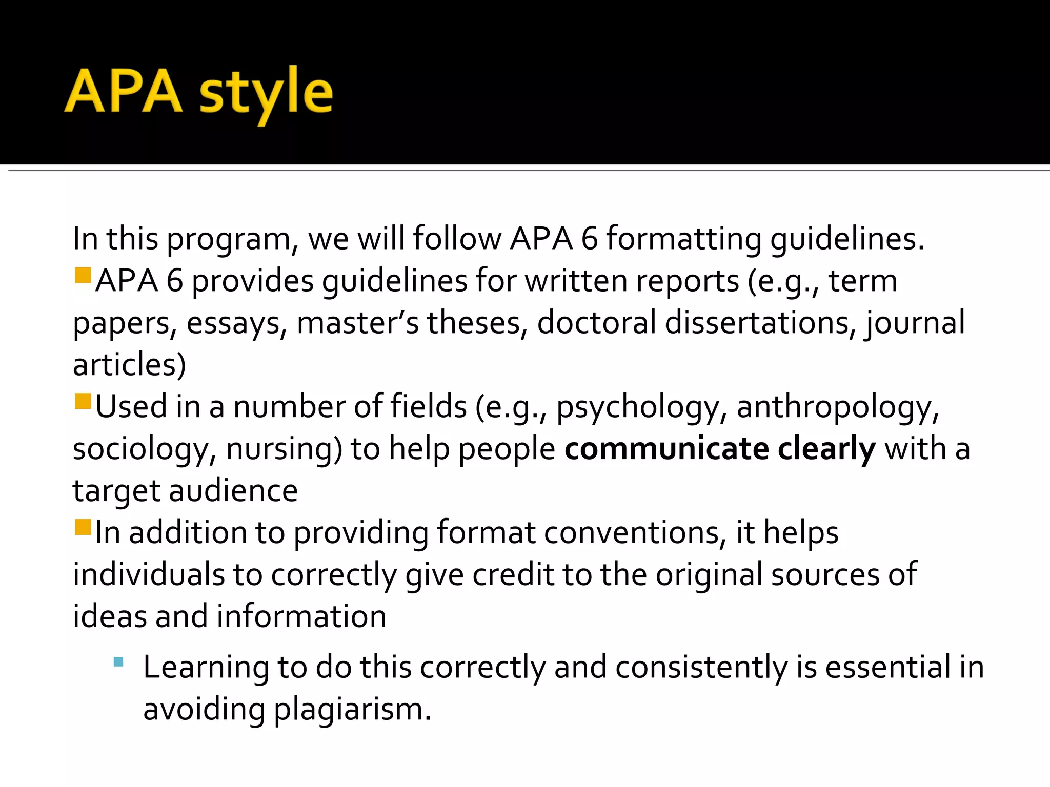 This document provides an overview of APA formatting guidelines. It explains that APA style is used in many fields like psychology and sociology. The document outlines how to format elements like title pages, citations, and references in APA style. It emphasizes learning APA style helps avoid plagiarism by giving proper credit. The document provides examples of citing sources in-text and creating reference list entries. It cautions that automated citation tools can contain errors, so understanding APA style is important.