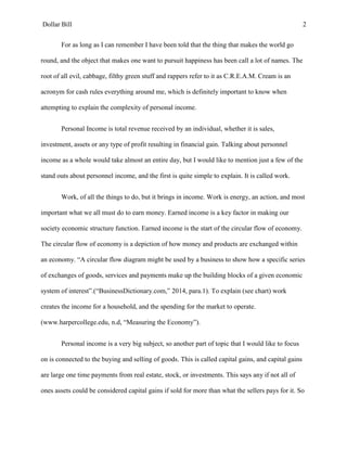 The document discusses different types of personal income, including earned income from work, capital gains from the sale of assets, passive income from assets like rental properties or stocks, and pensions from retirement plans. It explains that earned income starts the circular flow of the economy by creating household income that is then spent in the market. Capital gains are profits made from the increased value of assets when sold. Passive income requires little work to generate and comes from assets like rental properties. Pensions provide retirement income that can come from social security, disability plans, or employment-based plans. Overall, the document analyzes key components of personal income that contribute to the complexity of the topic.