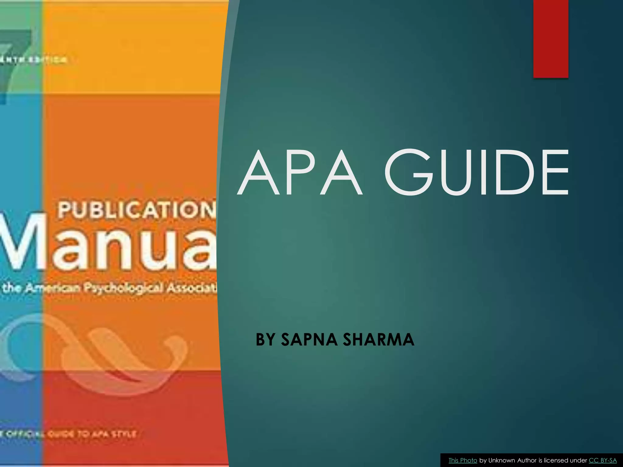This document provides an overview of the American Psychological Association (APA) style guide. It discusses the main sections of an APA paper including the title page, abstract, main body, and references page. It provides guidelines for formatting, citations, references, language style, and direct quotations. The document is intended to teach writers how to properly structure and cite sources in APA format.