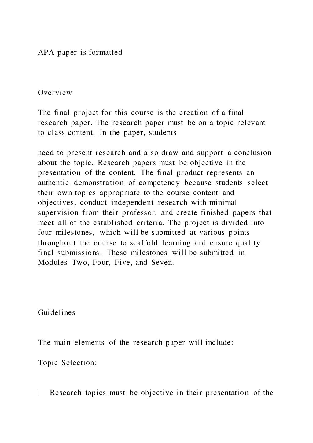need to present research and also draw and support a conclusion about the topic. Research papers must be objective in the presentation of the content. The final product represents an authentic demonstration of competency because students select their own topics appropriate to the course content and objectives, conduct independent research with minimal supervision from their professor, and create finished papers that meet all of the established criteria. The project is divided into four milestones, which will be submitted at various points throughout the course to scaffold learning and ensure quality final submissions. These milestones will be submitted in Modules Two, Four, Five, and Seven.