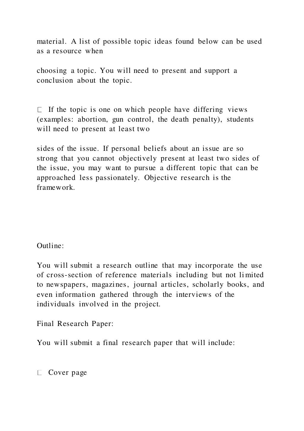 You will submit a research outline that may incorporate the use of cross-section of reference materials including but not limited to newspapers, magazines, journal articles, scholarly books, and even information gathered through the interviews of the individuals involved in the project.