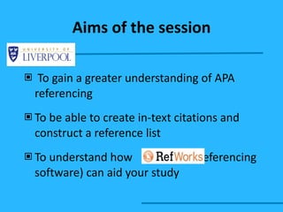 This document provides an overview of APA style formatting. It discusses the purpose of citations and references, including allowing readers to locate sources and establishing credibility. It covers constructing in-text citations, including providing author names, years of publication, and page numbers when needed. The document also reviews formatting reference list entries for different source types like books, articles, and websites. Finally, it introduces RefWorks as a tool for managing and citing sources.