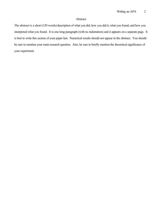 The document provides instructions for writing an APA-style research report, covering sections such as the abstract, introduction, method, results, and discussion. It describes the key elements that should be included in each section, such as stating the research question in the abstract, justifying hypotheses with past research in the introduction, and explaining the implications of the results in the discussion section. Guidelines are provided for formatting references according to APA style.