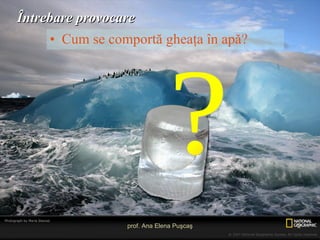 Experimentul a demonstrat că gheaţa pluteşte în apă, având o densitate mai mică decât a apei, fapt observat prin comportamentul cubului de gheaţă într-un pahar cu apă. Au fost observate și fenomenul de condensare pe pereții paharului și răcirea apei în contact cu gheața. Concluzia subliniază importanța acestor proprietăți în contextul natural, cum ar fi icebergurile care plutesc pe apă.