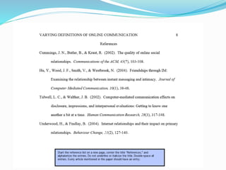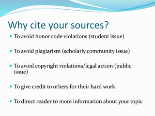 This document provides guidance on formatting papers and citing sources according to APA style. It explains why citations are important, when to cite, basic APA formatting guidelines for papers, how to format in-text citations, the reference list, and examples of citing different source types such as books, ebooks, and journal articles. Special attention is given to formatting titles, parenthetical citations, reference list entries, and including necessary publication information for different source formats.