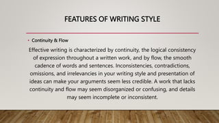 APA style guidelines address formatting for writing style, citations, numbers, tables and figures, headings, and references. Effective writing maintains continuity and flow between ideas through careful use of transitions and varied sentence structure. Precise word choices, concise writing, and clarity of meaning are emphasized.