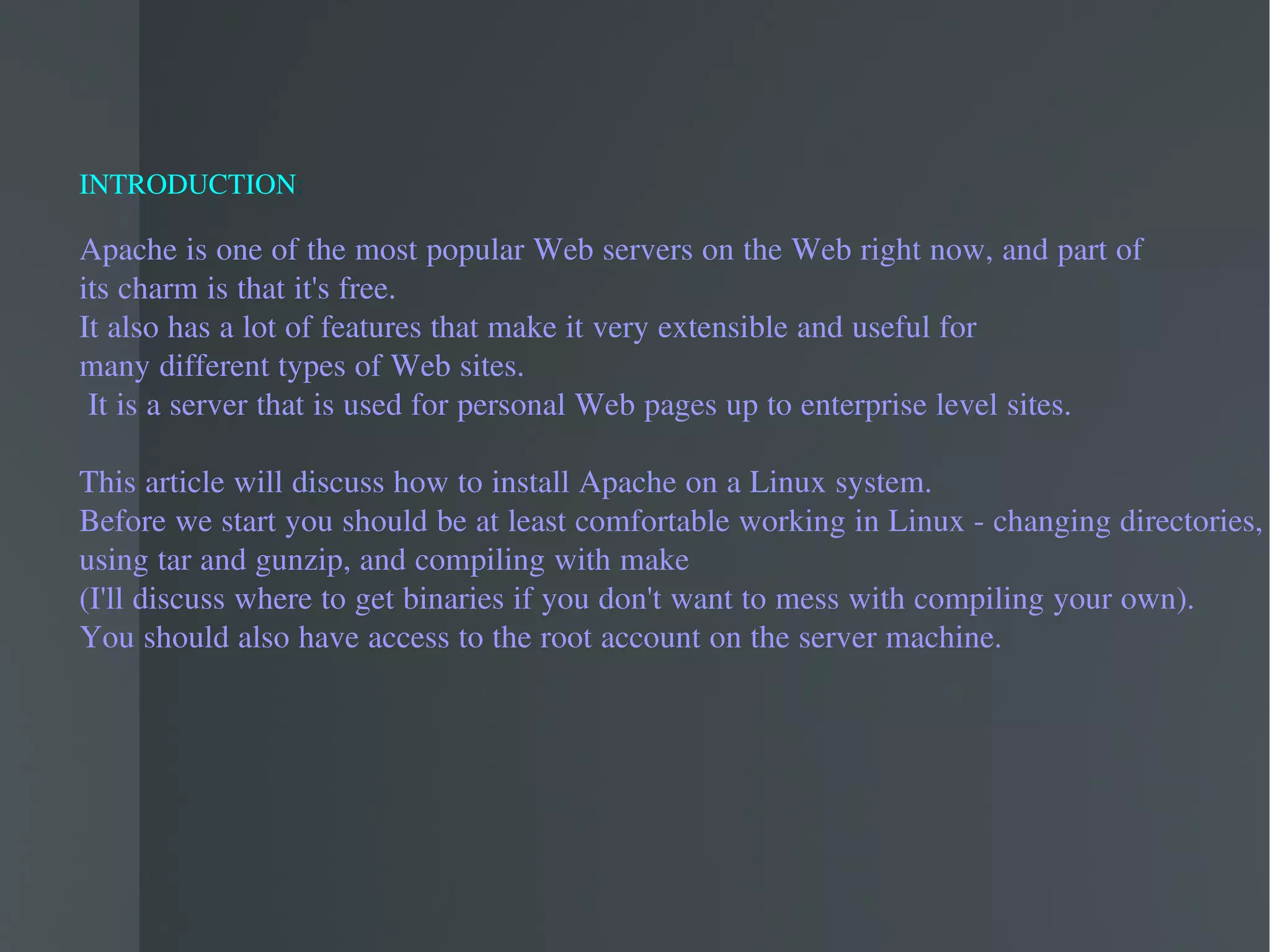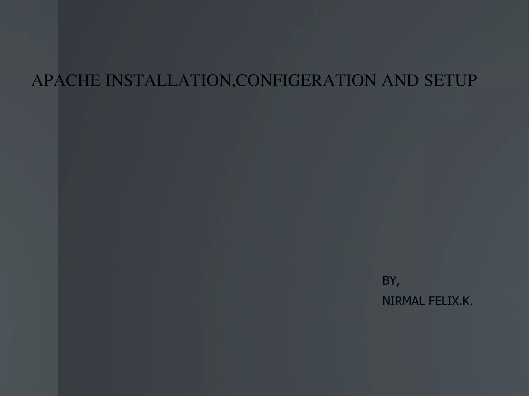 This document discusses the steps to install and configure the Apache web server on a Linux system. It includes downloading and extracting the Apache source files, configuring the files with the ./configure command, building and installing Apache with make and make install, customizing the httpd.conf configuration file, and testing the Apache installation by accessing http://localhost in a web browser. Key configuration directives like AccessConfig, AddDefaultCharset, AllowOverride, and DefaultType are also briefly described.
