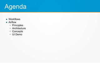 Apache Airflow is an open-source workflow management platform developed by Airbnb and now an Apache Software Foundation project. It allows users to define and manage data pipelines as directed acyclic graphs (DAGs) of tasks. The tasks can be operators to perform actions, move data between systems, and use sensors to monitor external systems. Airflow provides a rich web UI, CLI and integrations with databases, Hadoop, AWS and others. It is scalable, supports dynamic task generation and templates, alerting, retries, and distributed execution across clusters.
