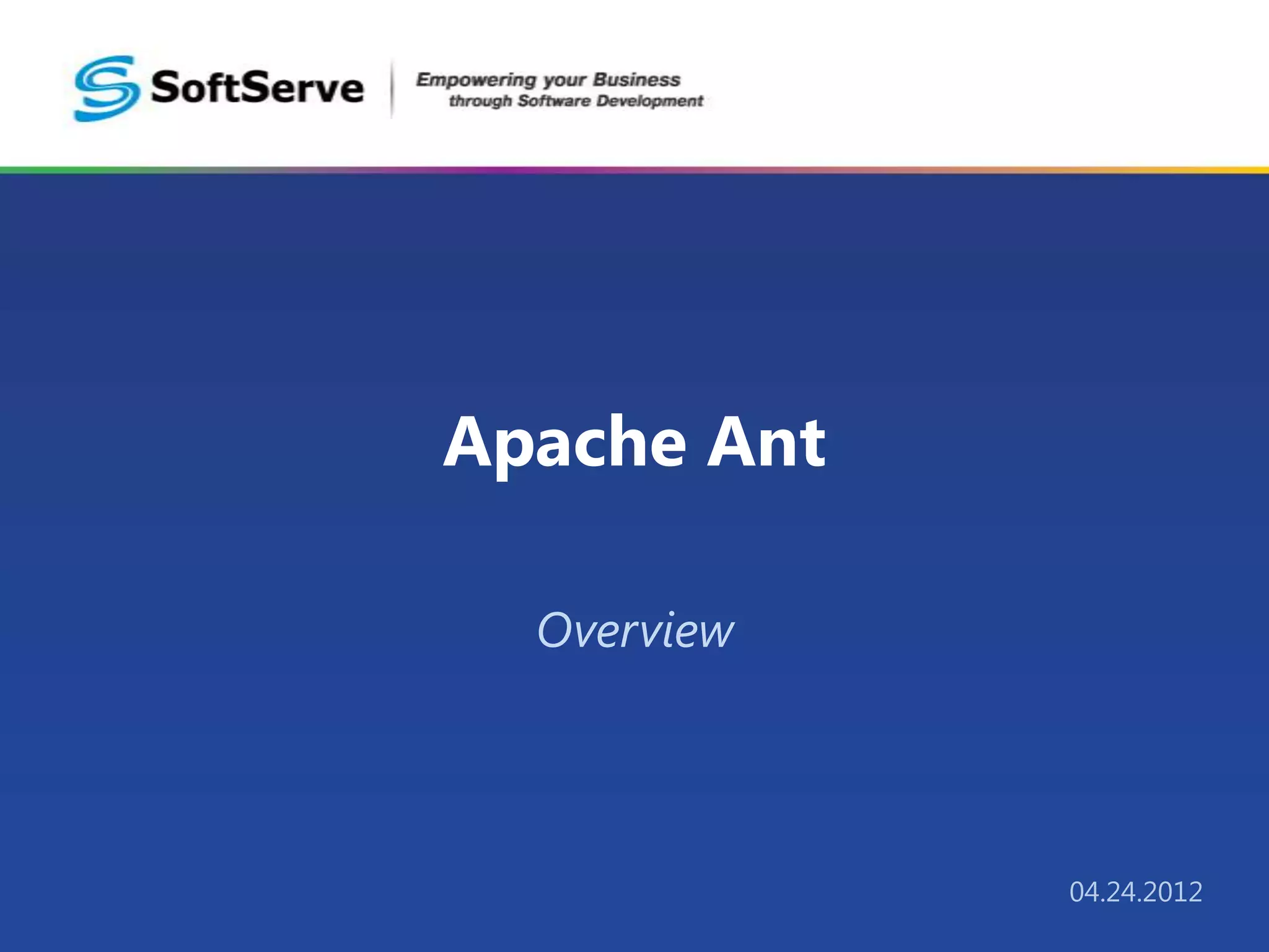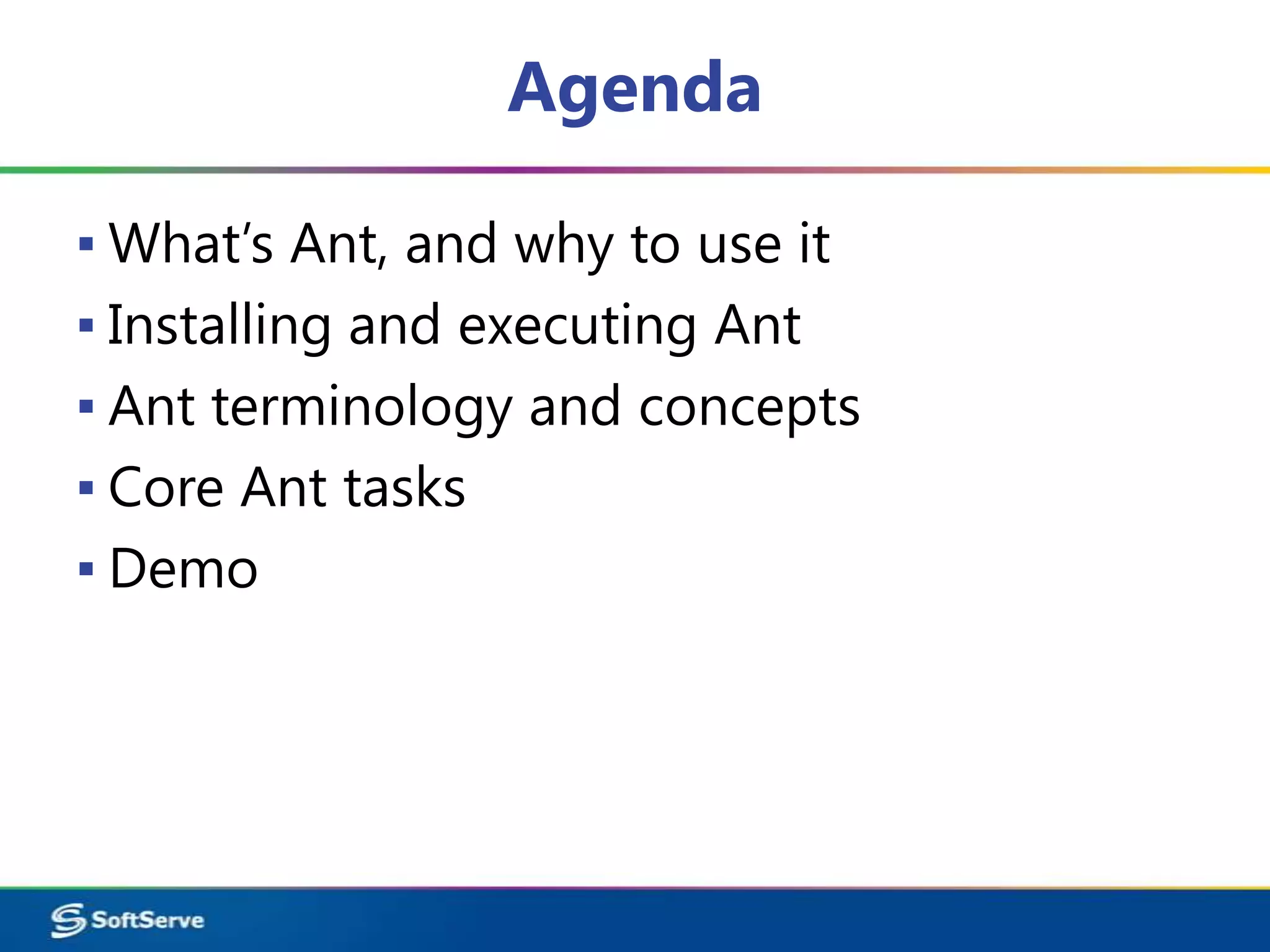 Apache Ant is a Java-based build tool used to automate software build processes. It is implemented in Java and is cross-platform, allowing builds to run on Windows and Linux systems wherever a Java VM runs. Ant uses XML configuration files called build files that define targets containing tasks like compiling source code. Common tasks include compiling Java code with javac, running tests, packaging code into JARs, and more. Properties can be used to set variables in Ant. Targets can depend on other targets to define an order of execution.