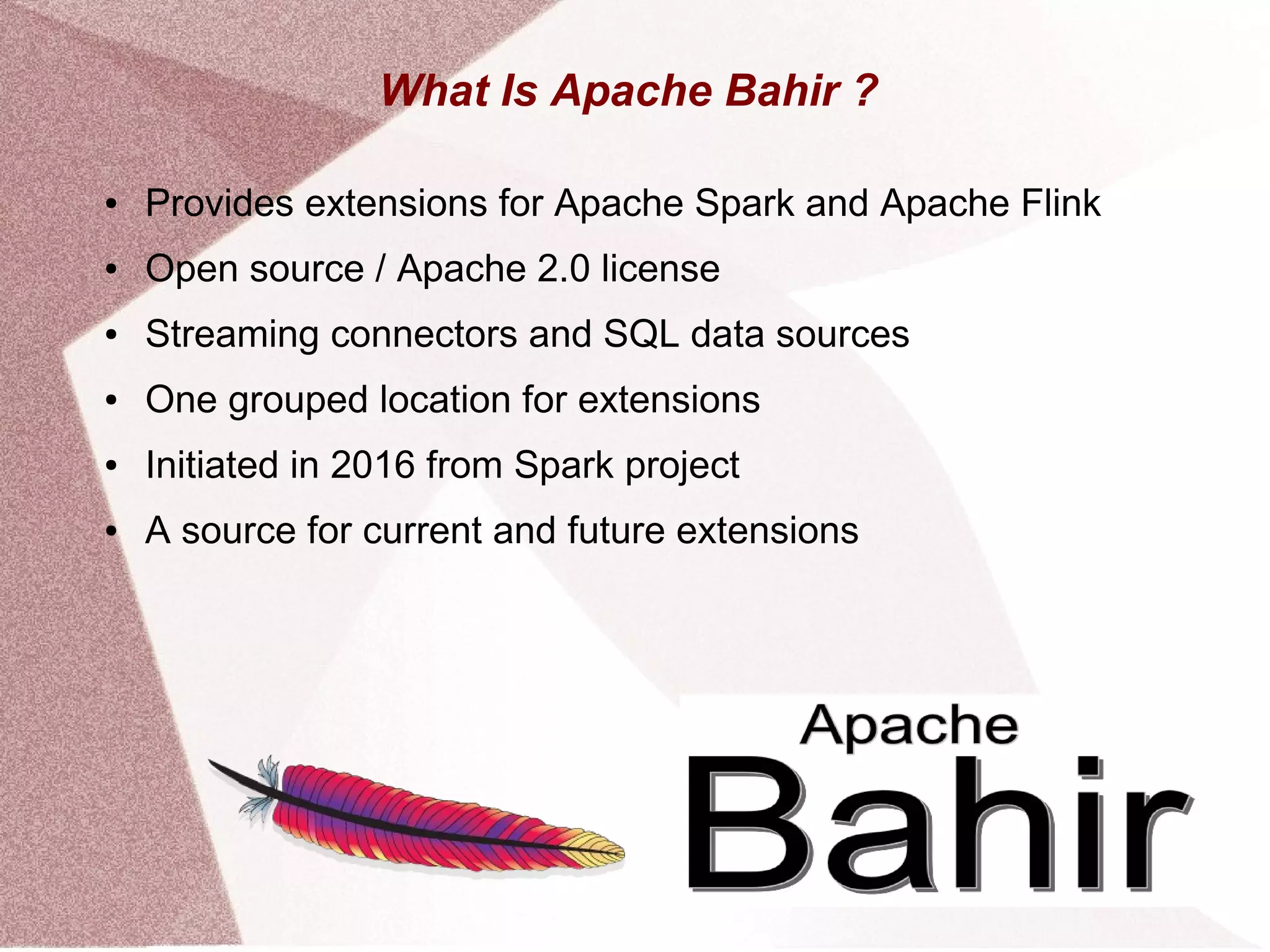 Apache Bahir provides streaming connectors and SQL data sources for Apache Spark and Apache Flink in a centralized location. It contains connectors for ActiveMQ, Akka, Flume, InfluxDB, Kudu, Netty, Redis, CouchDB, Cloudant, MQTT, and Twitter. Bahir is an important project because it enables reuse of extensions and saves time and money compared to recreating connectors. Though small, it covers multiple Spark and Flink extensions with the potential for future extensions. The project is currently active with regular updates to the GitHub repository and comprehensive documentation for its connectors.
