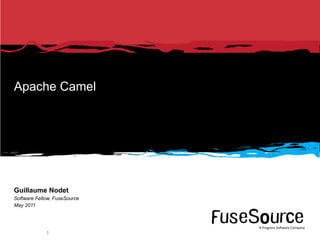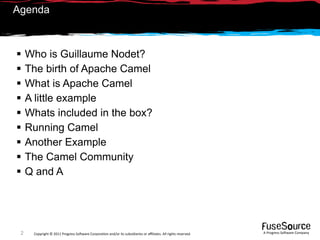 The document presents a presentation by Guillaume Nodet on Apache Camel, an open-source integration framework that simplifies integration using enterprise integration patterns and a domain-specific language (DSL). It includes foundational information about Apache Camel's history, features, examples of usage, and the components available in Camel. Additionally, the document highlights Camel's mission to make integration easier and more accessible to developers.