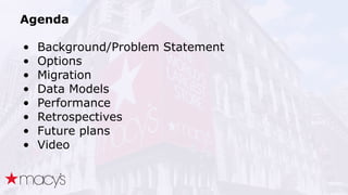 Cassandra was chosen over other NoSQL options like MongoDB for its scalability and ability to handle a projected 10x growth in data and shift to real-time updates. A proof-of-concept showed Cassandra and ActiveSpaces performing similarly for initial loads, writes and reads. Cassandra was selected due to its open source nature. The data model transitioned from lists to maps to a compound key with JSON to optimize for queries. Ongoing work includes upgrading Cassandra, integrating Spark, and improving JSON schema management and asynchronous operations.