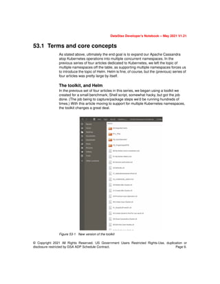 The May 2021 edition of the DataStax Developer's Notebook focuses on expanding Apache Cassandra operations atop Kubernetes into multiple concurrent namespaces. It discusses the use of Helm for better control in deploying the Cassandra operator, alongside introducing techniques for cloning Cassandra clusters across namespaces. The document outlines tools and scripts essential for managing multiple environments and data center configurations within Kubernetes, noting potential limitations with earlier Kubernetes versions.