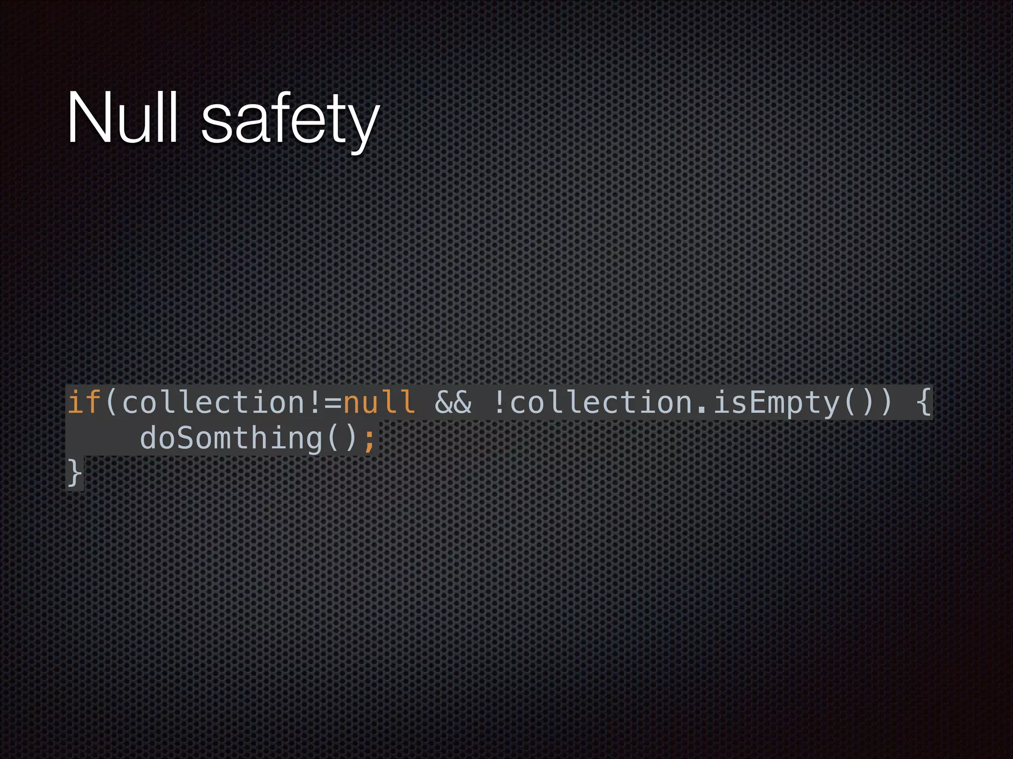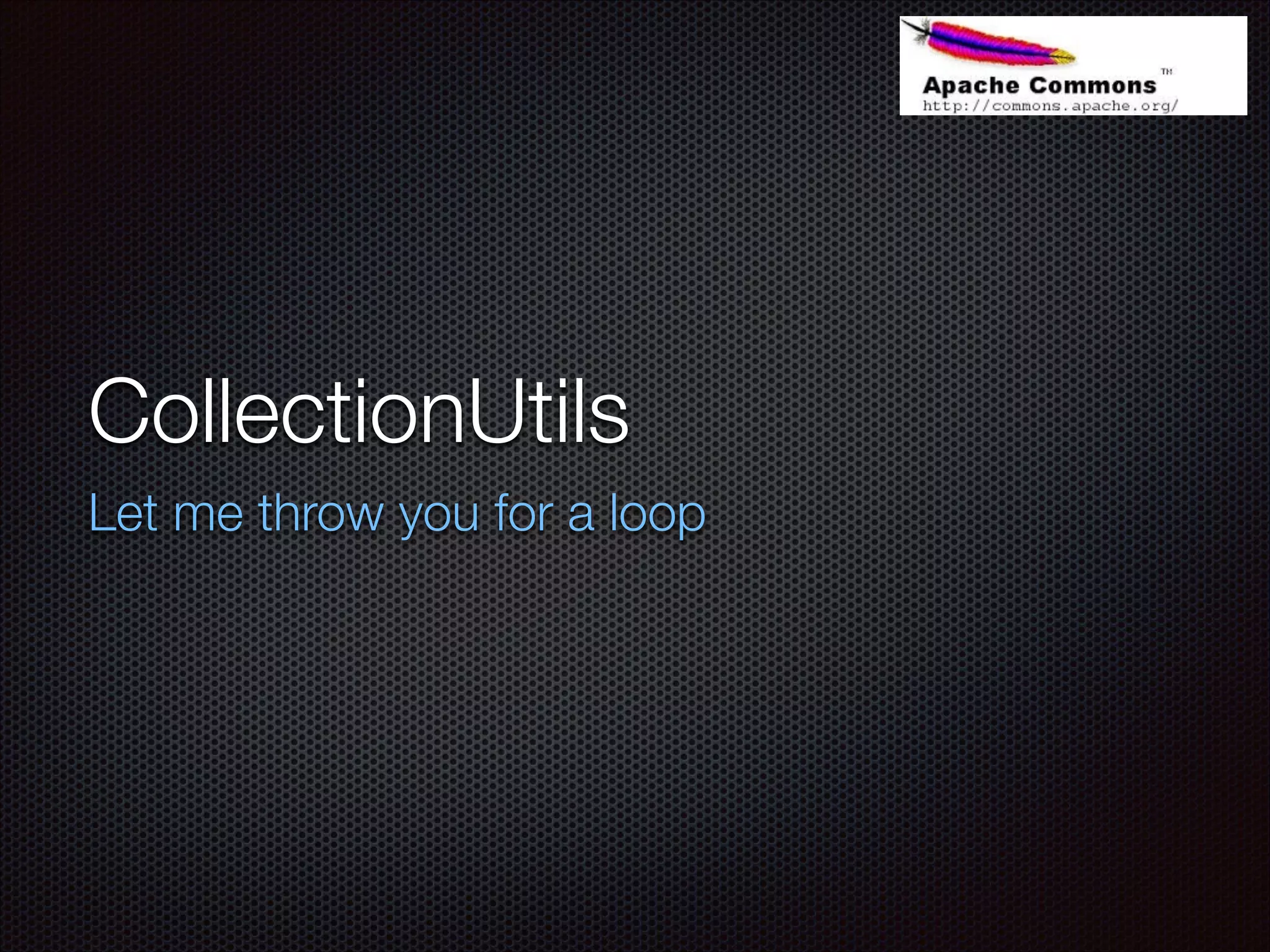 This document discusses utilities for working with collections and sets in Java, including checking for null/empty collections, performing set operations like union and intersection, filtering/transforming collections with predicates and transformers, and iterating over collections with closures. It provides examples of implementing these utilities with both imperative code and reusable predicates, transformers, and closures. The utilities allow for cleaner logic, testable code, and a more functional style.