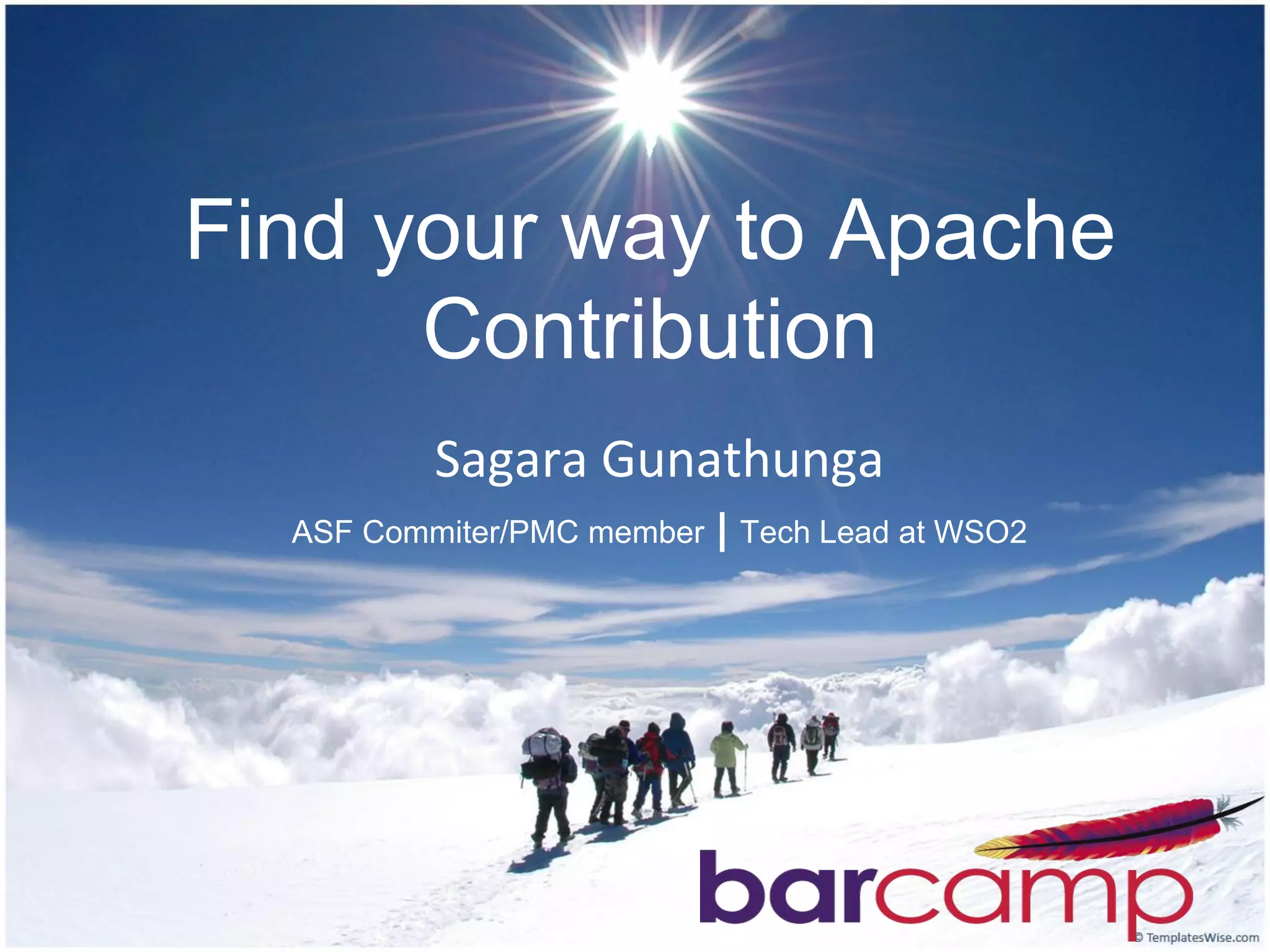 This document provides information to help individuals find ways to contribute to Apache projects. It outlines various roles and backgrounds that are welcome to contribute, such as engineers, writers, students, and more. It also provides guidance on how to get started, including finding a suitable project, participating in discussions, addressing issues, and submitting patches for review. The document emphasizes starting small, such as by helping others on mailing lists or reproducing sample issues, and provides several project-specific resources for new contributors.