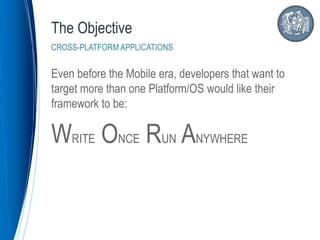Apache Cordova is an open-source framework that allows developers to use standard web technologies like HTML, CSS, and JavaScript to build applications that can be deployed across various mobile and desktop platforms. It works by packaging the application's code and assets into a wrapper application that loads the content into a webview. Plugins can be added to access device capabilities. The Cordova CLI provides commands for creating, building, and running Cordova projects across platforms in a consistent way. Frameworks like Angular and UI frameworks like Ionic can be used to organize larger Cordova applications.