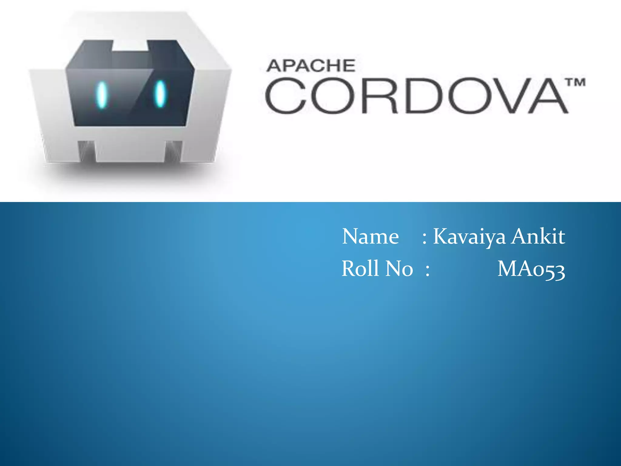 This document provides an overview of Apache Cordova, a mobile application development framework. It allows developers to use HTML, CSS and JavaScript to build applications that can be deployed across various mobile platforms. The document discusses what Cordova is, the platforms it supports, its architecture, how to install it, development using Cordova, advantages like cross-platform development, and disadvantages like some platform limitations.