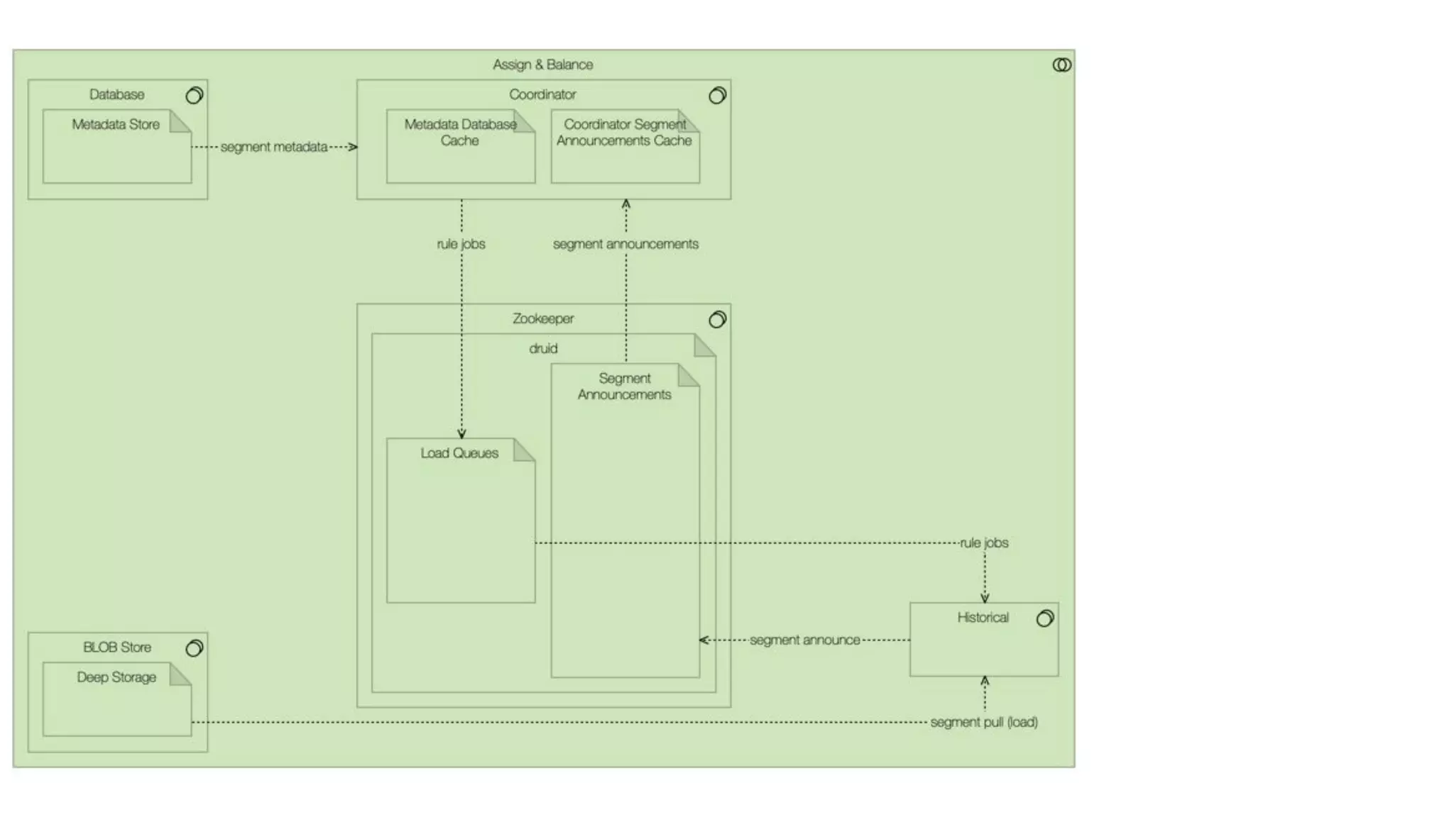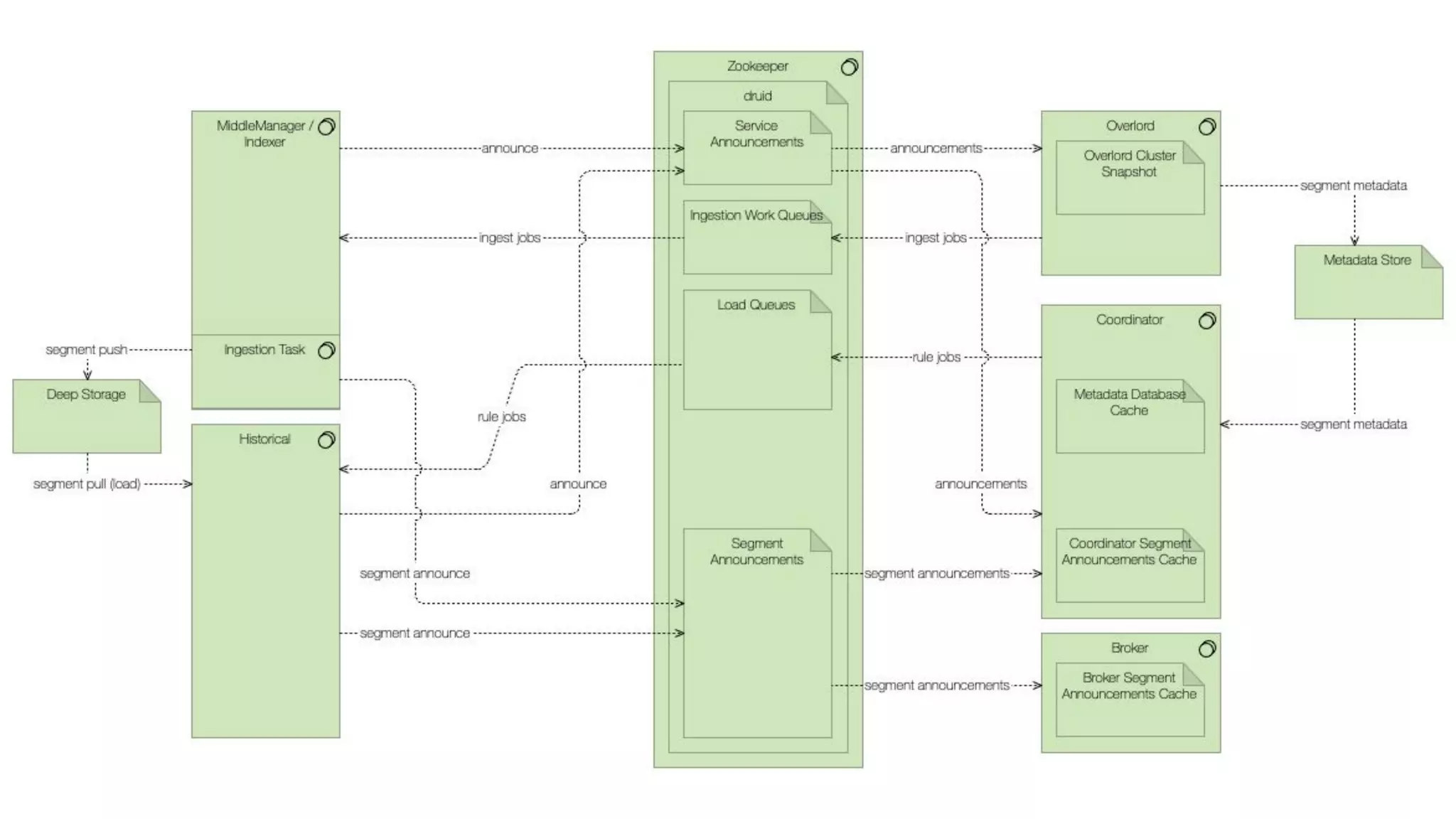This document summarizes the key components and collaborations in Apache Druid. It describes Zookeeper's role in coordination, the Overlord's role in task management, the Broker's role in query routing, and the Middle Manager's role in ingestion and indexing. It provides diagrams illustrating how these components work together to ingest and store distributed data, and answer queries in a scalable way.