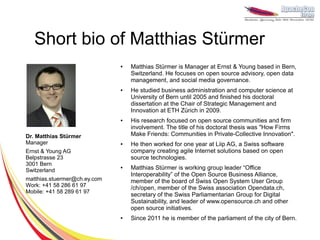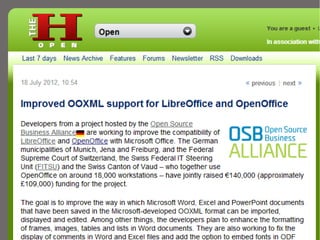 Dr. Matthias Stürmer at Ernst & Young discusses an initiative to improve OOXML integration in LibreOffice and Apache OpenOffice, addressing the current shortcomings in handling .docx files to facilitate migration to open-source office suites. The collaborative project involves public institutions and community organizations, aiming to mobilize resources and develop solutions to collective action problems faced by stakeholders. The project's phases include initialization, funding, and implementation, with the goal of enhancing document interoperability and functionality within open-source office applications.
