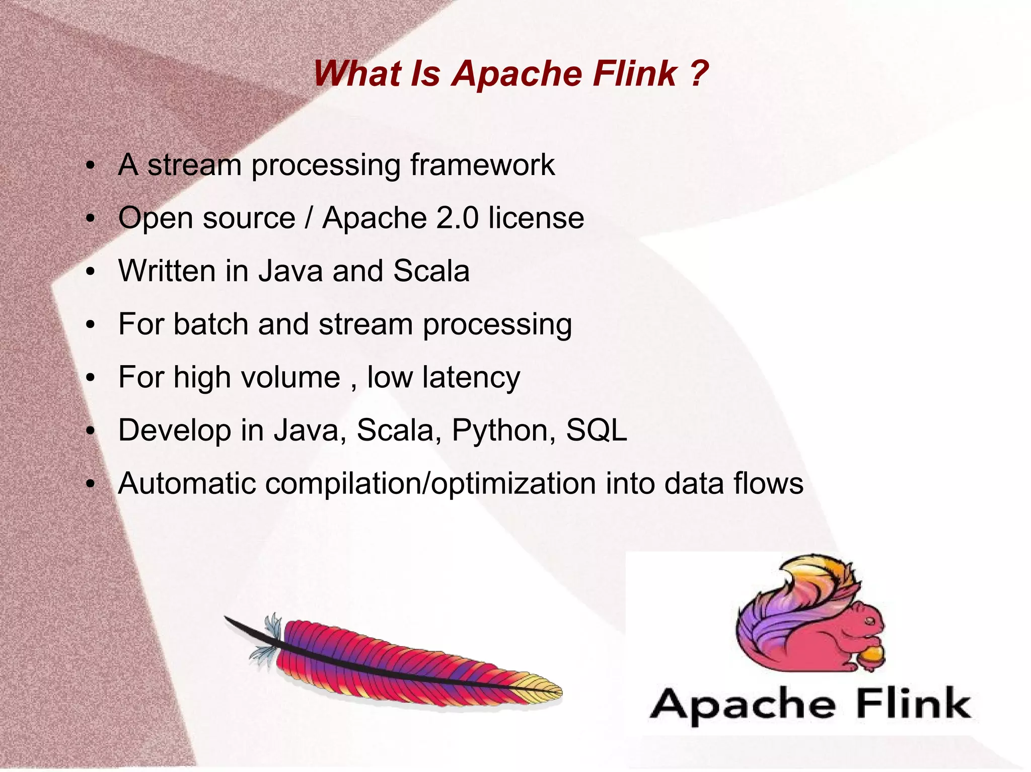 Apache Flink is an open-source stream processing framework designed for high-volume, low-latency batch and stream processing, written in Java and Scala. It supports multiple data sources and provides powerful APIs for event processing, state management, and analytics, along with libraries for complex event processing and graph analysis. Flink is deployable on various cluster managers and is tailored for applications such as fraud detection, data analytics, and real-time data pipelines.