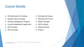 The document provides an overview of Apache Hadoop, highlighting its motivation, basic concepts, and various components such as MapReduce, Hive, Pig, and Sqoop. It emphasizes the significance of handling big data through distributed processing across clusters of commodity computers, with key features including scalability, efficiency, and reliability. Additionally, it mentions the historical context of Hadoop's development and its applications in data analysis and business intelligence.