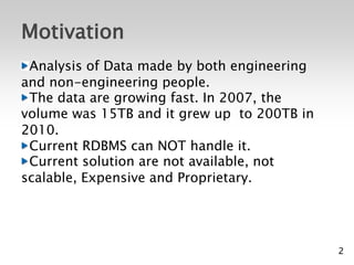 The document discusses the rapid growth of data and the inadequacy of current RDBMS solutions, leading to the introduction of Apache Hadoop and Hive for data processing and analysis. Hive is a data warehousing infrastructure built on Hadoop that allows for SQL-like queries and supports various data-intensive applications. The document also covers Hive's architecture, configuration, CLI commands, and use cases, emphasizing its scalability and extensibility for processing large datasets.