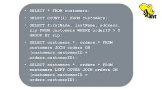 Apache Hive is a data warehouse software built on top of Hadoop that allows users to query data stored in various databases and file systems using an SQL-like interface. It provides a way to summarize, query, and analyze large datasets stored in Hadoop distributed file system (HDFS). Hive gives SQL capabilities to analyze data without needing MapReduce programming. Users can build a data warehouse by creating Hive tables, loading data files into HDFS, and then querying and analyzing the data using HiveQL, which Hive then converts into MapReduce jobs.