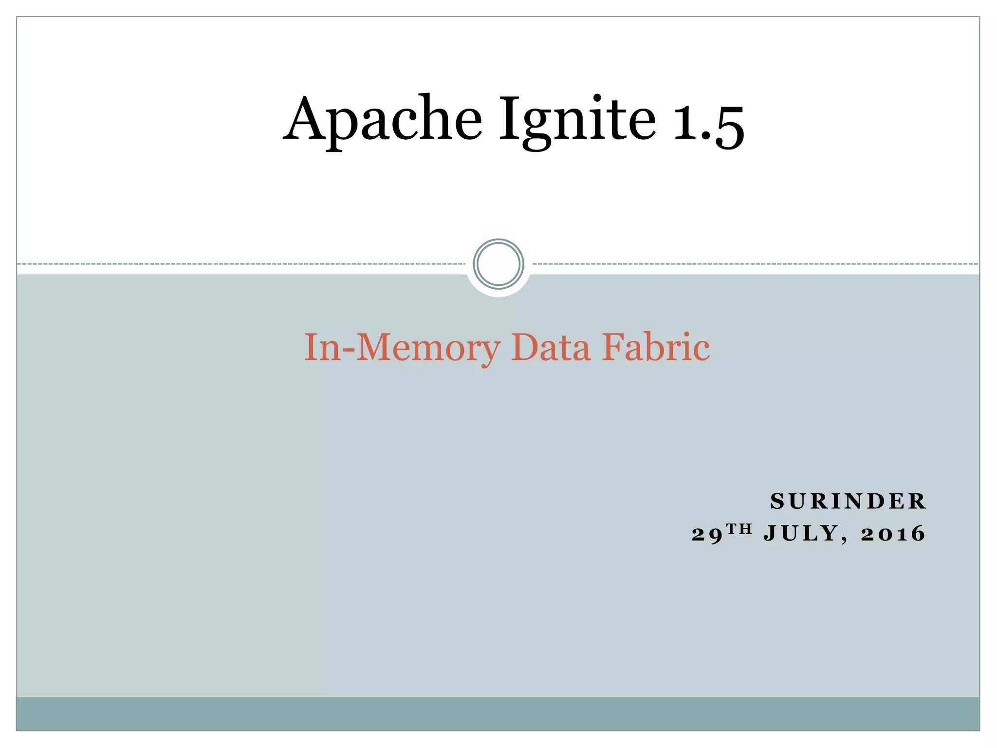 This document provides an overview of Apache Ignite 1.5, an in-memory data fabric for high performance computing. It discusses key components including the distributed in-memory data grid, caching APIs, distributed SQL queries, off-heap storage, eviction policies, persistence, data rebalancing, and different types of cache queries. The data grid implements JCache and allows for distributed transactions on large datasets in real-time. It provides a unified architecture for distributed caching, processing, and analytics.