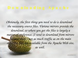 Apache is an open source web server software that runs on over half of all internet servers. The document provides instructions on downloading, installing, and configuring Apache on Windows and Linux systems. It also lists and describes 30 different Apache configuration directives that can be used to customize the server setup.