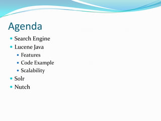 This document provides an overview of searching and Apache Lucene. It discusses what a search engine is and how it builds an index and answers queries. It then describes Apache Lucene as a high-performance Java-based search engine library. Key features of Lucene like its powerful query syntax, relevance ranking, and flexibility are outlined. Examples of indexing and searching code in Lucene are also provided. The document concludes with a discussion of Lucene's scalability and how it can handle increasing query rates, index sizes, and update rates.