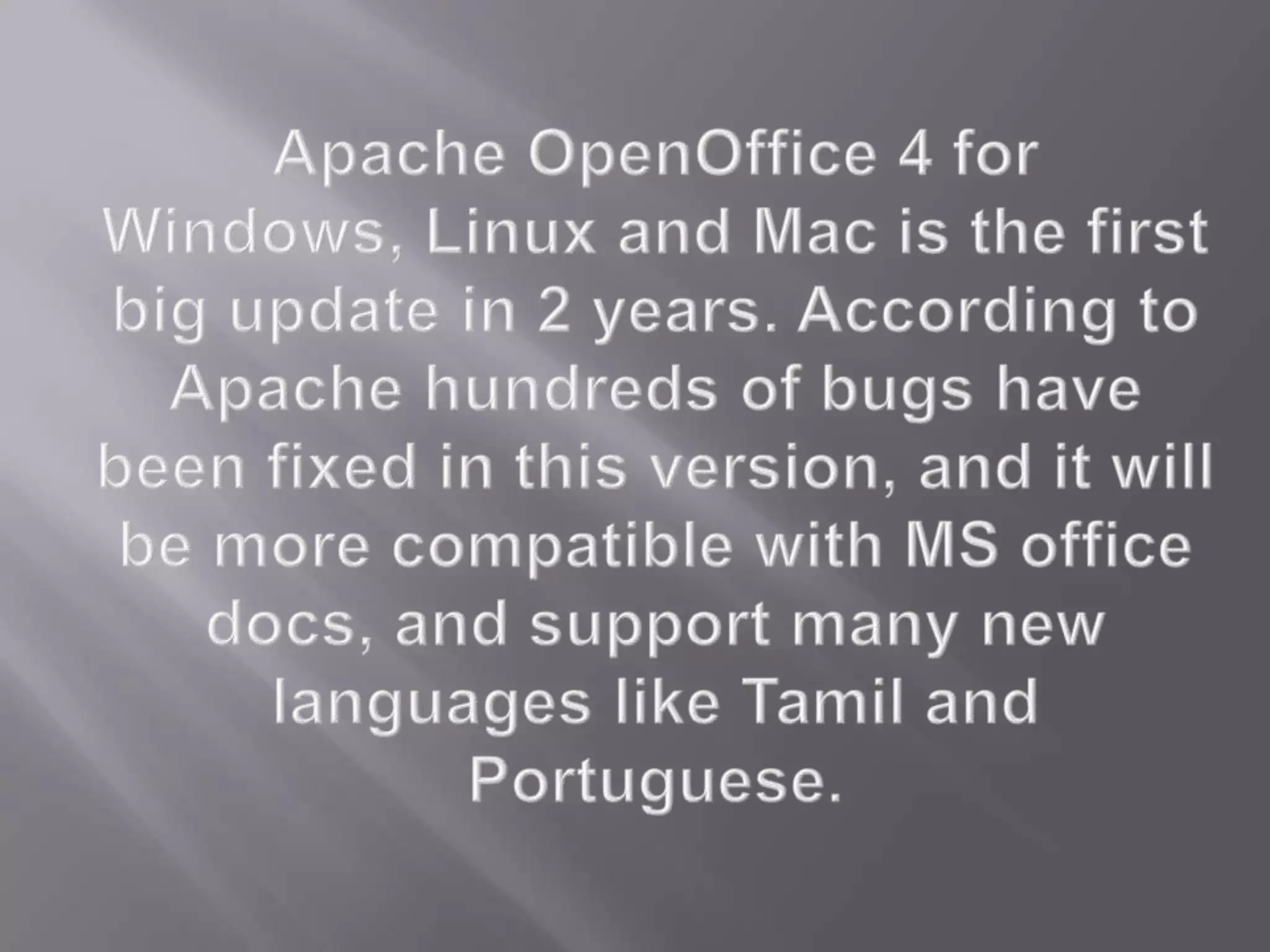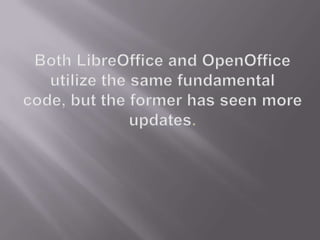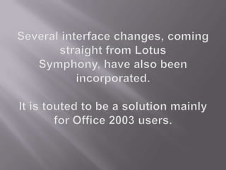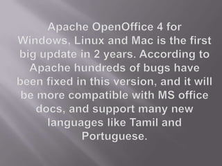 OpenOffice 4.0 has been updated with a single installer to choose which components to install. It includes Writer, Calc, Impress, Math, Base and Draw, which are similar to older versions of Microsoft Office programs. The interfaces include toolbars, menus and a sidebar for common tools, but some feel it could include more OpenOffice tools. The update aims to better preserve document fidelity when opening files between OpenOffice and Microsoft Office formats.